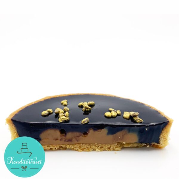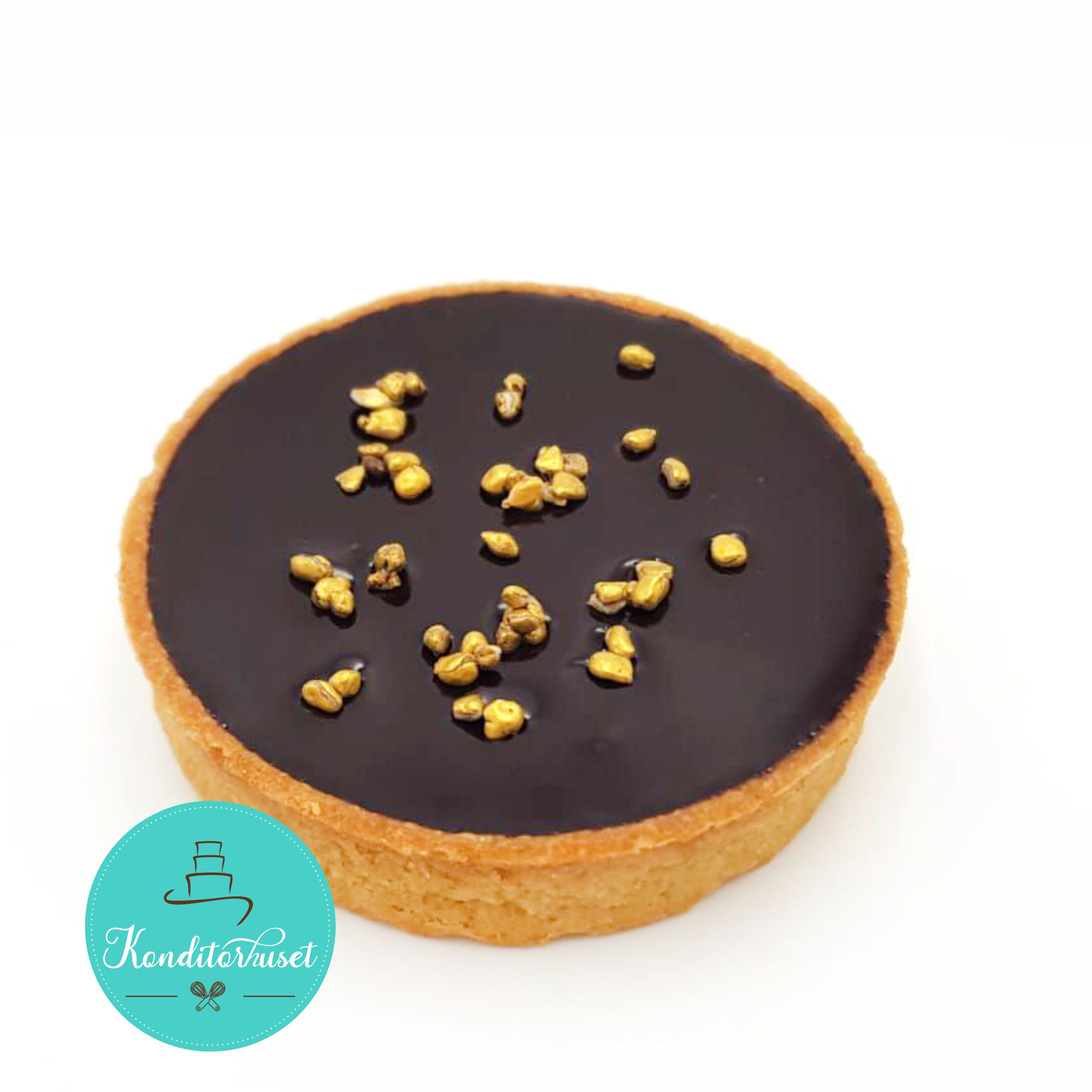 Butter tartlet shell, filled with a salty caramel mix with a 60% dark chocolate ganache. Decorated with gold-dusted chocolate pieces.
